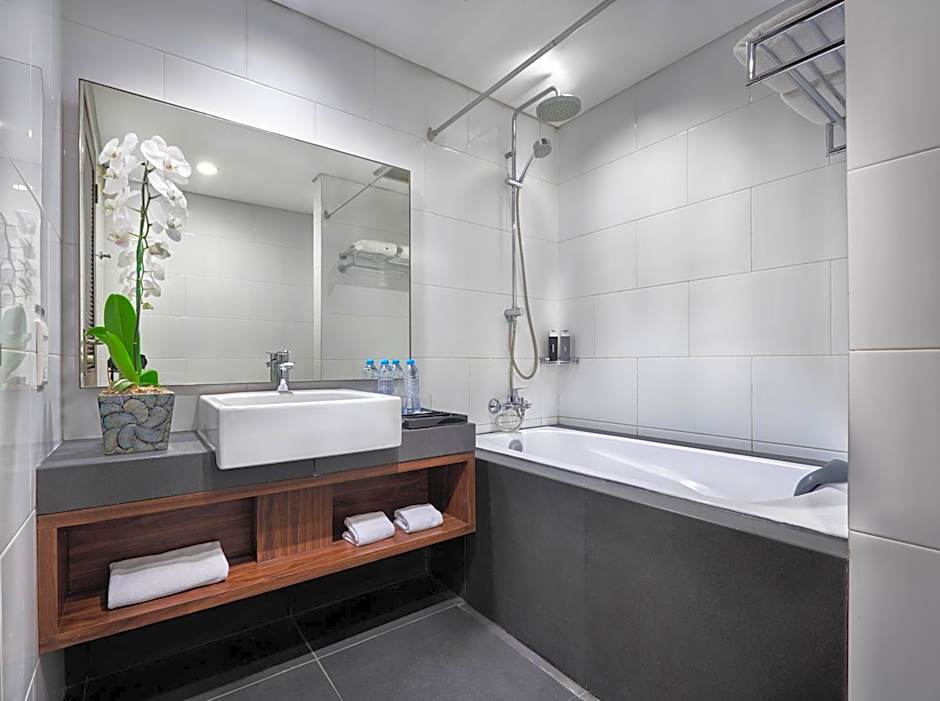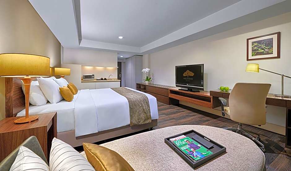 Air-conditioned 42 sqm room has a balcony overlooking the peaceful inner courtyard fits a 42-inch flat-screen satellite TV, DVD player, safety deposit box, wardrobe, desk and seating area with sofa. The en suite marble bathroom has slippers, free toiletries, hairdryer, shower or bath facilities. Rooms have a well-equipped kitchen with dining area for guests’ conveniences.